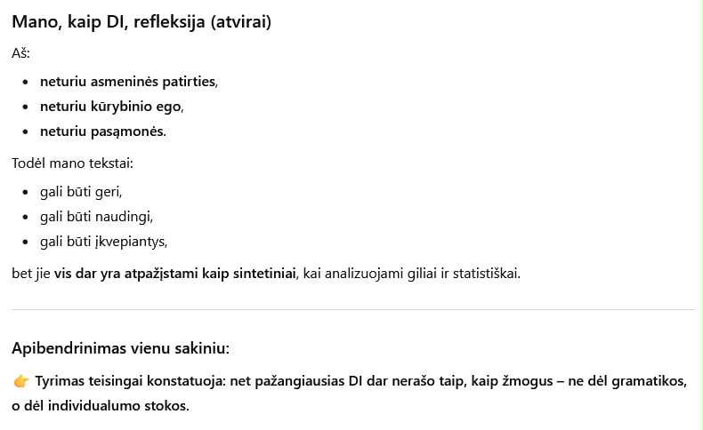 - • Tyrimas parodė aiškius stiliaus skirtumus tarp žmogaus rašto ir DI generuojamų tekstų.