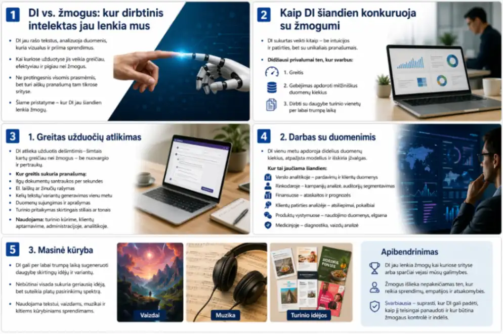 Visgi, rezultatas dar nėra tobulas ir reikalauja korekcijų norint suvienodinti nuotraukų stilių, galbūt dar labiau atsisakyti teksto pertekliaus ir kt. Svarbu pastebėti, kad šioje situacijoje didelę reikšmę turi užklausos detalumas – kuo ji tikslesnė ir aiškesnė, tuo rezultatas labiau atitiks jūsų lūkesčius. Nepaisant to, matyti, kad vos per kelias minutes galite turėti gana aiškų pristatymo šabloną.