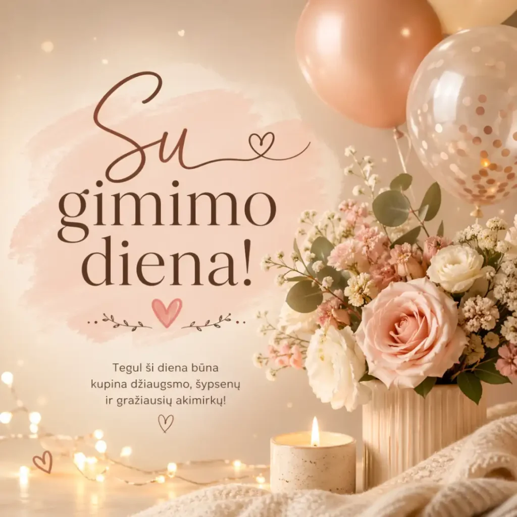Antruoju bandymu sukūrėme gimtadienio atviruką su lietuvišku tekstu „Su gimimo diena!“. Kaip matyti, čia „Images 2.0“ modelis pademonstravo savo gebėjimą dirbti su lietuvišku tekstu ne tik atkartodamas konkrečią frazę, bet ir pateikdamas papildomą taisyklingą tekstą.