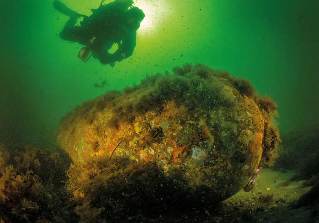 Mokslinių tyrimų naras tiria Antrojo pasaulinio karo jūrinę miną Kolberger Heide amunicijos išmetimo zonoje, Kylio išoriniame fjorde. Šaltinis: Christian Howe, www.h2owe.de / GEOMAR