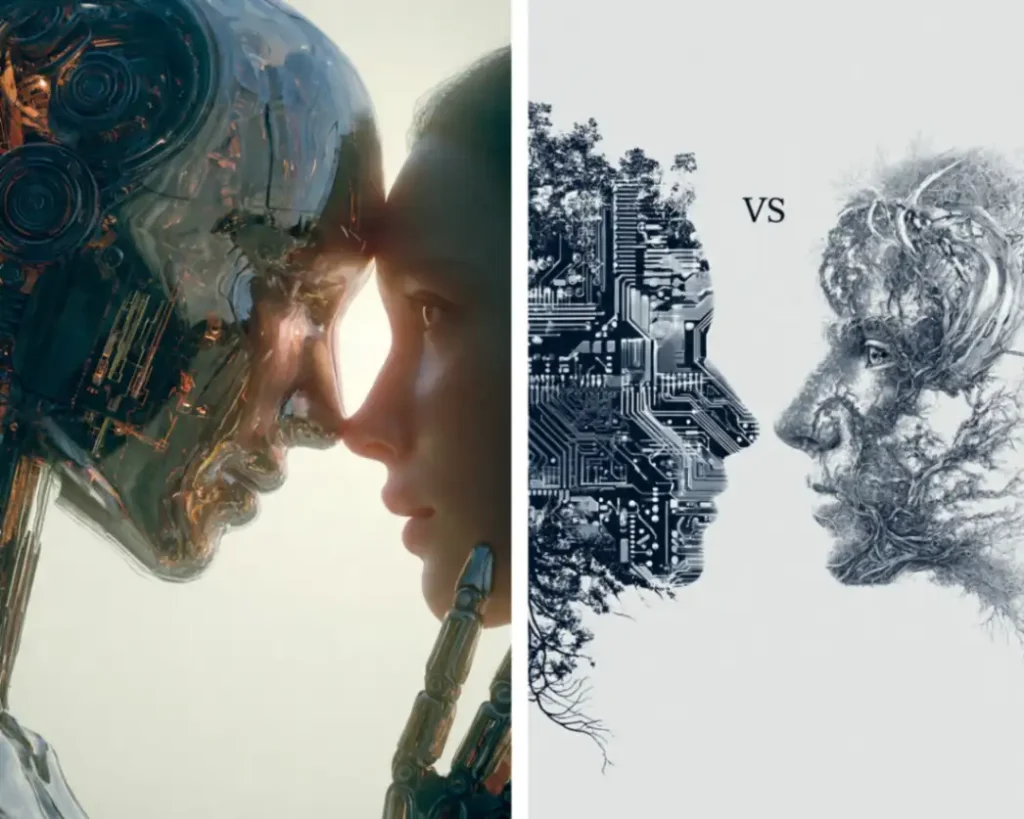 Išbandėme patys – „Meta AI“ vos per 20 sekundžių mums sugeneravo 4 vaizdų rezultatus užklausai: Sugeneruok man nuotrauką, kuri atspindėtų straipsnio temą: DI vs. žmogus: kur dirbtinis intelektas jau lenkia mus.