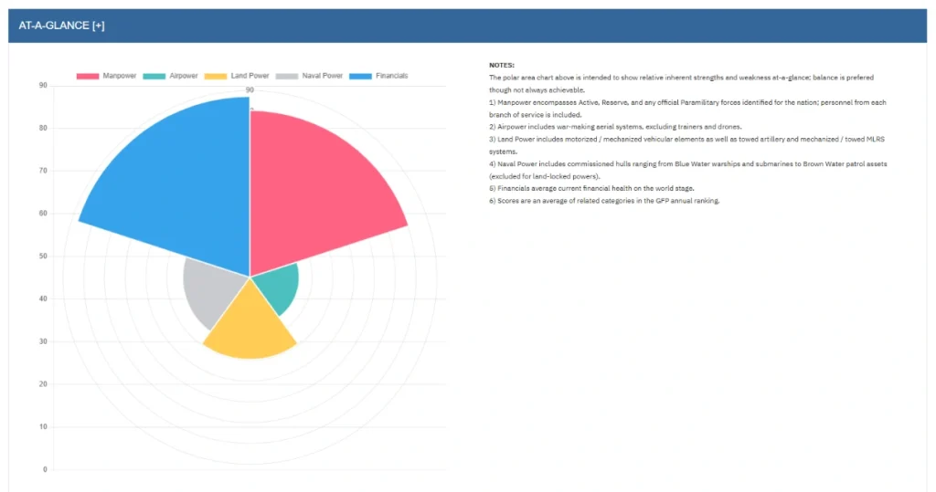 „Global Firepower“ sudaromas vertinant šalių karinę galią pagal kompleksinį modelį, kuris apima daugiau nei 60 skirtingų rodiklių. Jie lygina ne tik kariuomenės dydį, biudžetą, išteklius, bet ir realų valstybės gebėjimą vykdyti karines operacijas.