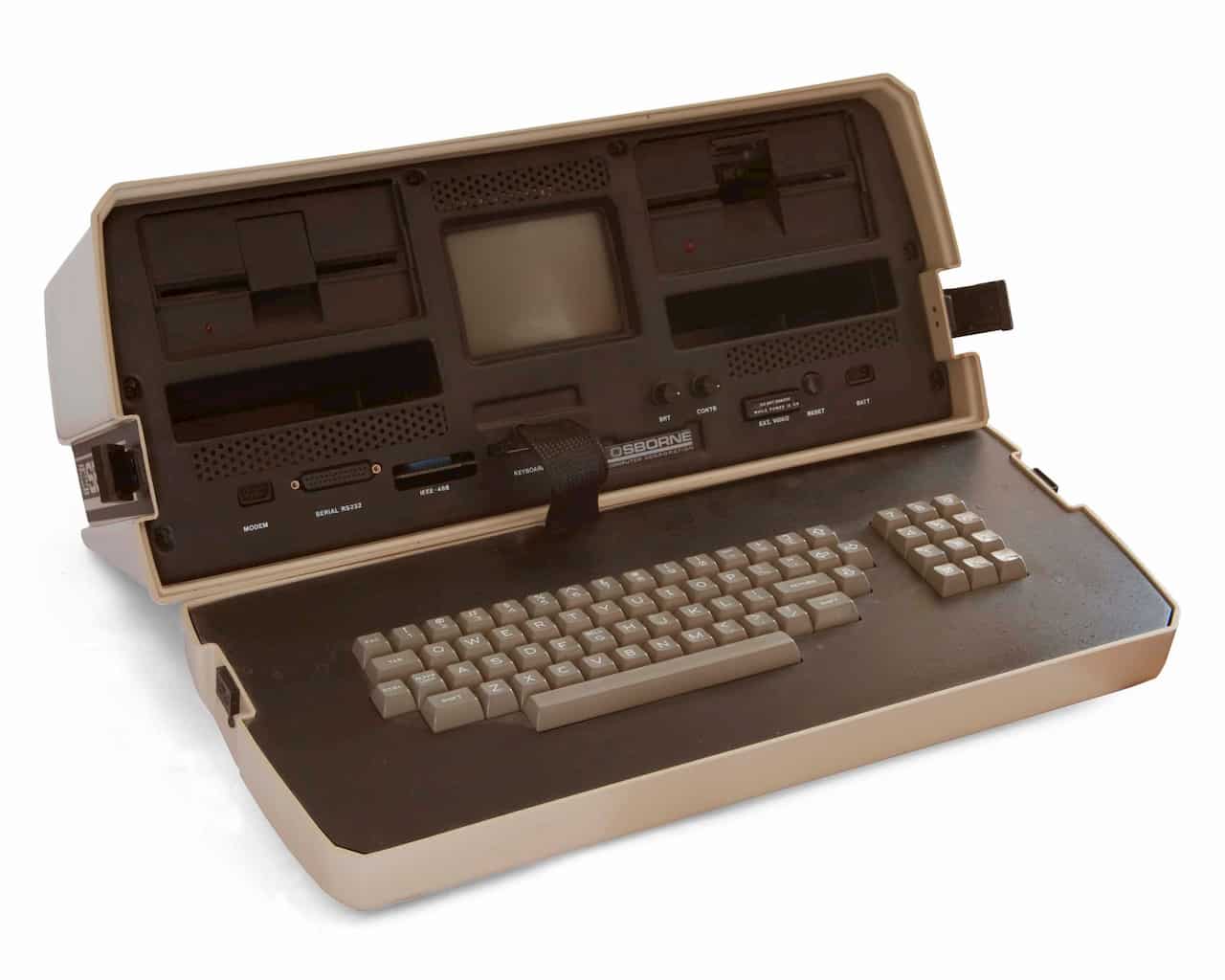 Pirmasis pasaulyje toks kompiuteris buvo nešiojamas ta prasme, kad atrodė kaip mažas lagaminas, bet beveik 11 kg svorio. Taip pat šis įrenginys dar neturėjo baterijos, todėl kiekviename sustojime reikėjo sieninio lizdo – visgi atradimu džiaugėsi žurnalistai, iš viešbučio kambario galėdami pateikti savas istorijas, o teisininkai teismo procesų metu rengdami bylų santraukas.