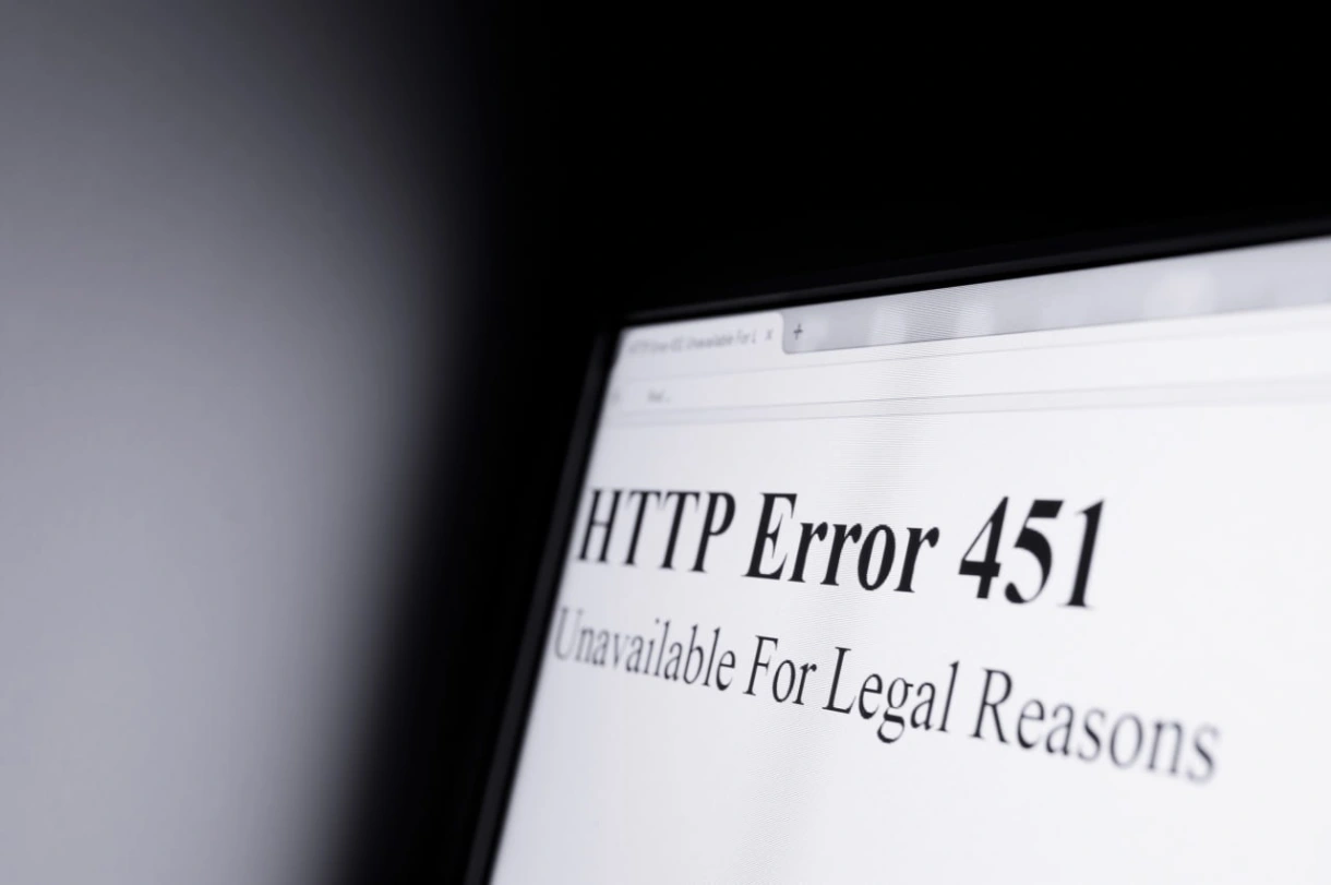 Kompiuterio ekrane rodomas pranešimas „HTTP Error 451 – Unavailable for Legal Reasons“. Šaltinis: TechNaujienos / Shutterstock