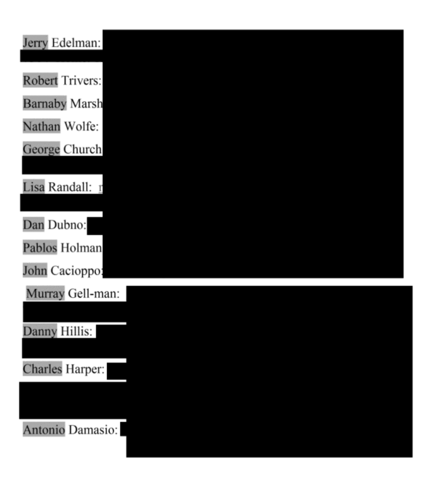 Paviešintuose dokumentuose taip pat aptinkami susirašinėjimai su žinomais akademinės bendruomenės atstovais – fizikos teoretiku Lawrence’u Kraussu bei Harvardo universiteto fizike Lisa Randall.