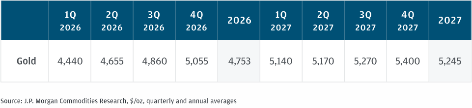„JPMorgan Global Research“ prognozuoja, kad 2026 m. ketvirtąjį ketvirtį auksas vidutiniškai gali siekti apie 5 055 JAV dolerius už unciją, o iki 2027 m. pabaigos – kilti link 5 400 JAV dolerių už unciją. Nors pabrėžiama, kad kainų kilimas nebūtinai bus tolygus, bankas argumentuoja, jog pagrindiniai paklausą palaikantys veiksniai dar nėra išsekę.