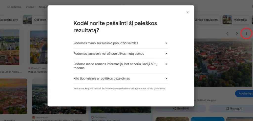 Nuotraukų atveju, „Google“ neseniai supaprastino tvarką – galima pateikti pašalinimo užklausą tiesiogiai iš paieškos rezultatų. Paieškos lange pasirinkus „vaizdų“ skiltį ir paspaudus ant konkrečios nuotraukos (tris taškus viršutiniame dešiniajame kampe) galima pasirinkti „Pašalinti rezultatą“.