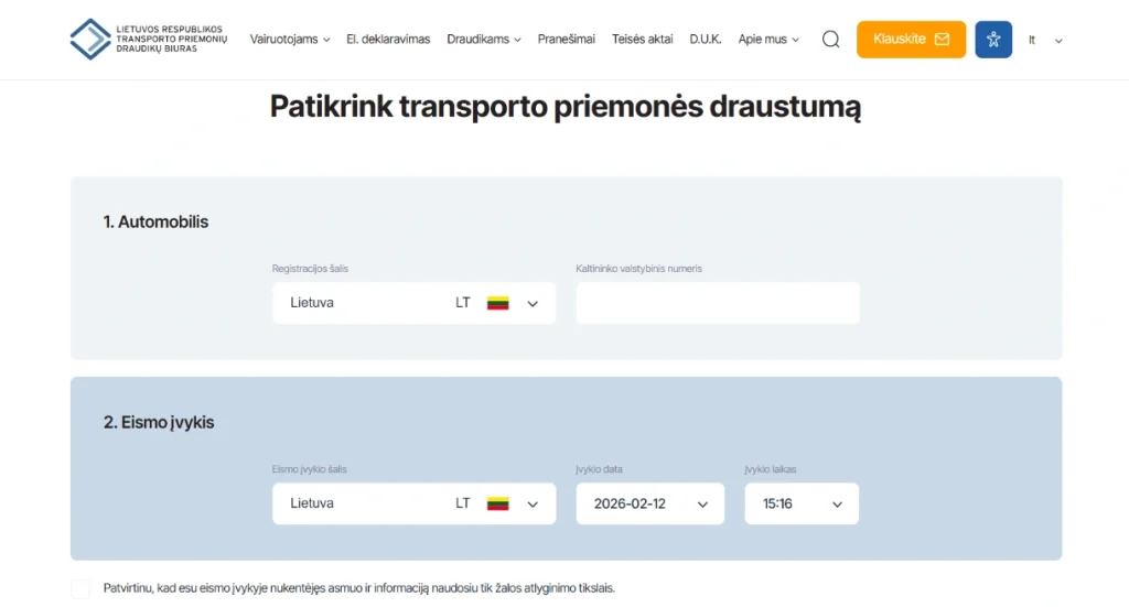 Svetainėje užtenka įvesti automobilio valstybinį numerį, o rezultatuose matysite draudimo būseną, bendrovę ir kontaktinę informaciją.