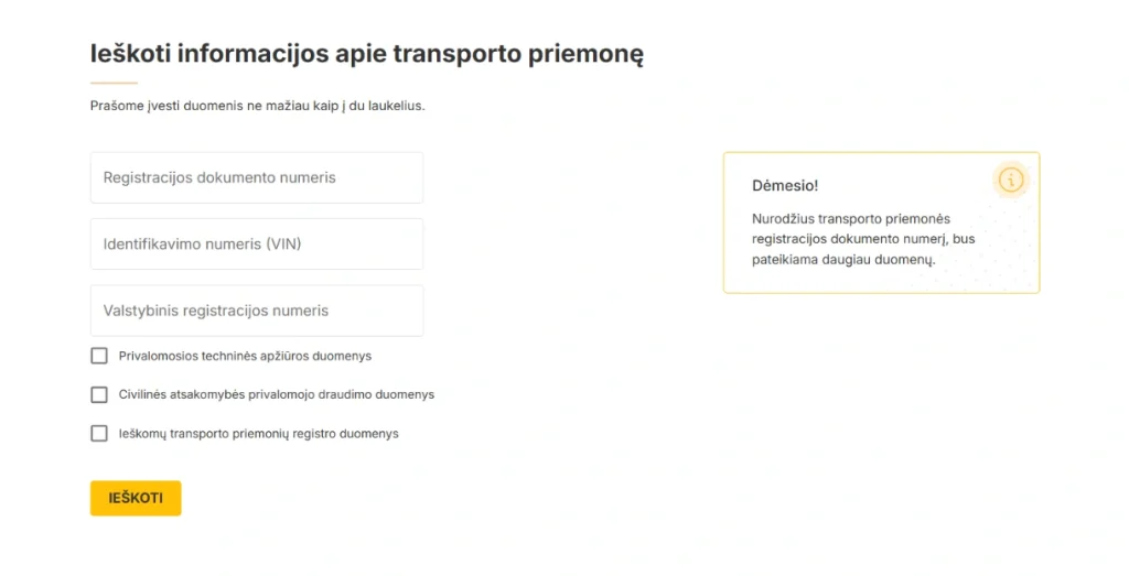 Čia galite ne tik pamatyti civilinės atsakomybės privalomojo draudimo (TPVCA) duomenis, tačiau ir patikrinti privalomosios techninės apžiūros informaciją ir ieškomų transporto priemonių registro duomenis.