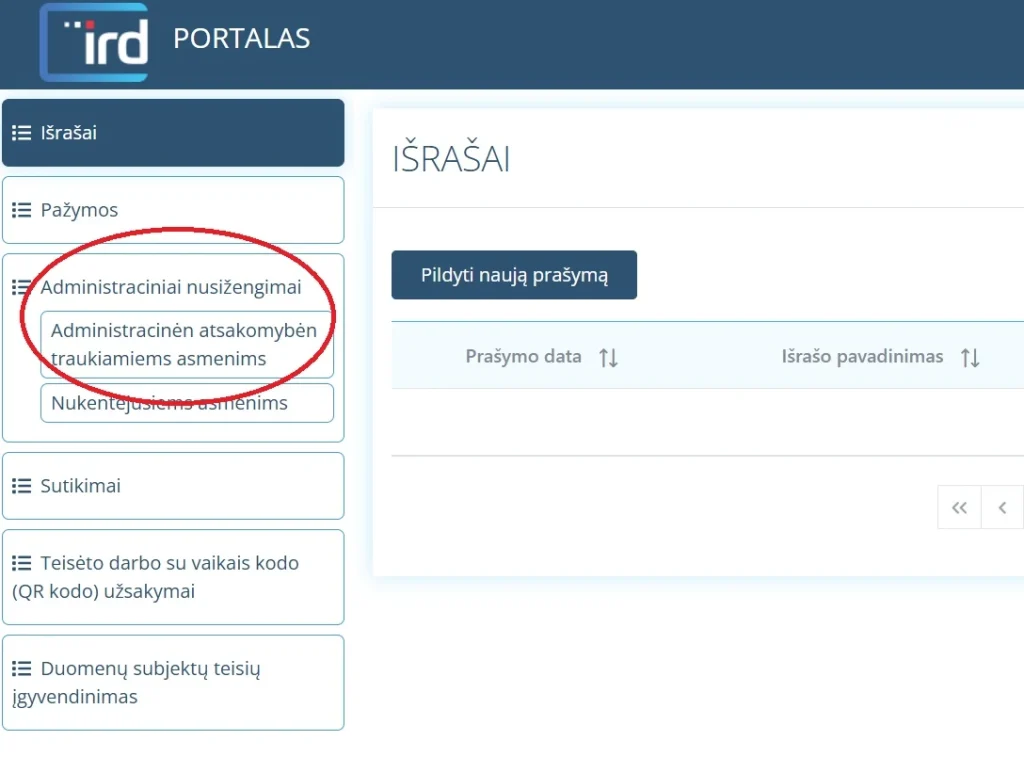 - IRD sistema – pateikia informaciją apie administracinį nusižengimą.