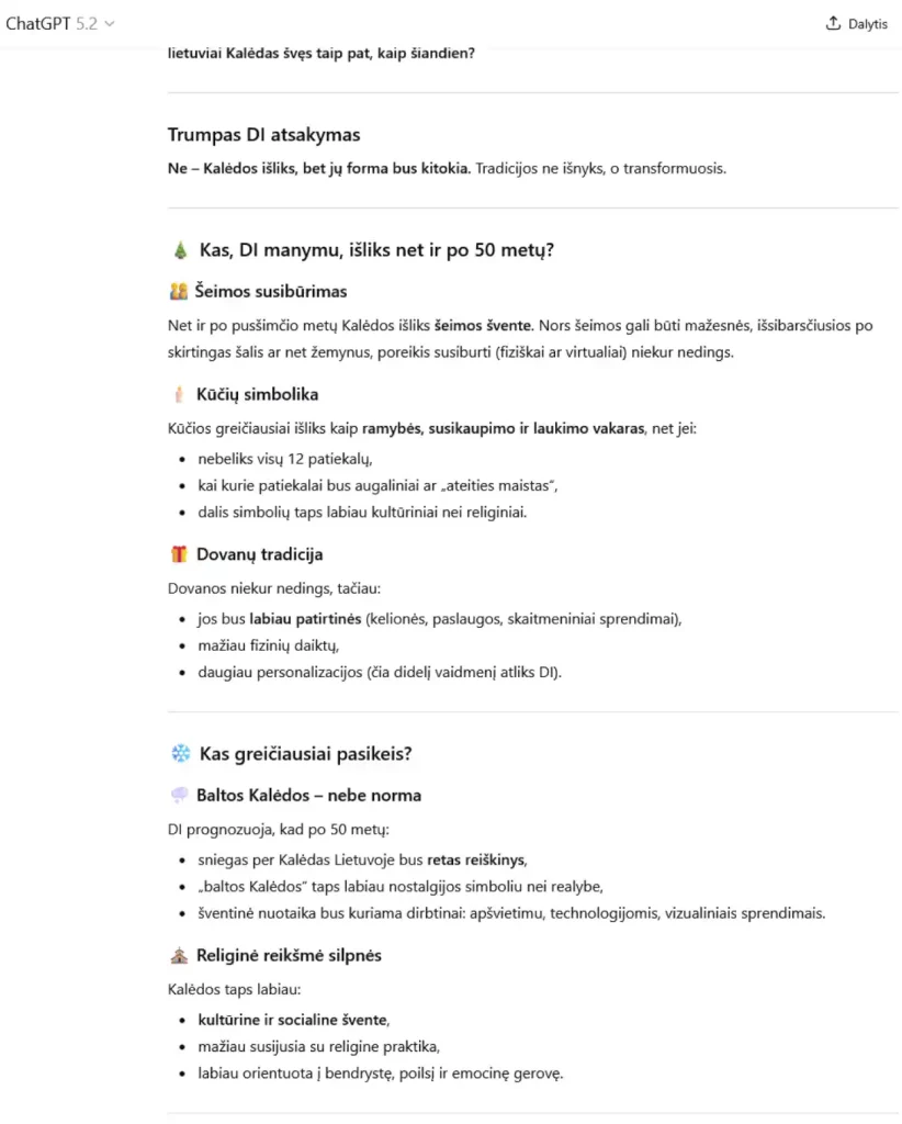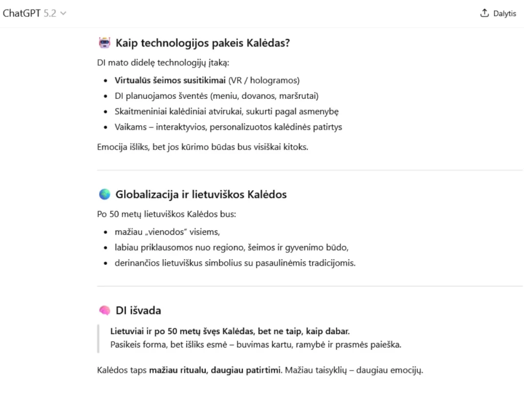Technologijų, klimato kaitos ir visuomenės pokyčių akivaizdoje vis dažniau keliami klausimai, ar tradicinės šventės išliks tokios pačios kaip šiandien. Technaujienos.lt redakcija paklausė pažangiausio „ChatGPT“ 5.2 modelio, ar po 50 metų lietuviai vis dar švęs Kalėdas taip, kaip dabar. Dirbtinio intelekto (DI) pateiktas vertinimas rodo, kad pati šventė išliks, tačiau jos forma ir turinys neišvengiamai keisis.
