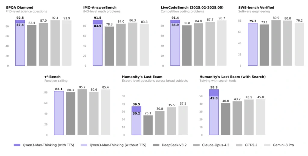 Be minėto testo, modelis taip pat gerai pasirodė programavimo ir matematikos užduotyse. Aukšti rezultatai kituose testuose rodo, kad „Qwen-3 Max Thinking“ geba efektyviai spręsti tiek techninius, tiek akademinius klausimus ir gali konkuruoti su pažangiausiais šiuo metu rinkoje esančiais DI modeliais.