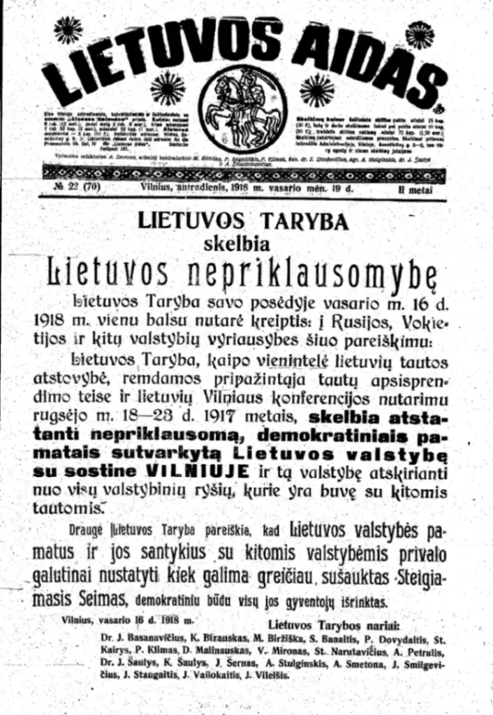 1918 m. vasario 16-ąja Vilniuje, Pilies g. 26, Lietuvos Tarybos nariai pasirašė dokumentą, atkuriantį nepriklausomą valstybę. Aktą pasirašė 20 žmonių, tačiau jų biografijos rodo aiškų dėsningumą – tai ne profesionalūs politikai, o skirtingų sričių specialistai, kurie valstybę kūrė pasidaliję funkcijomis: vieni rūpinosi komunikacija, kiti infrastruktūra, finansais ar švietimu.