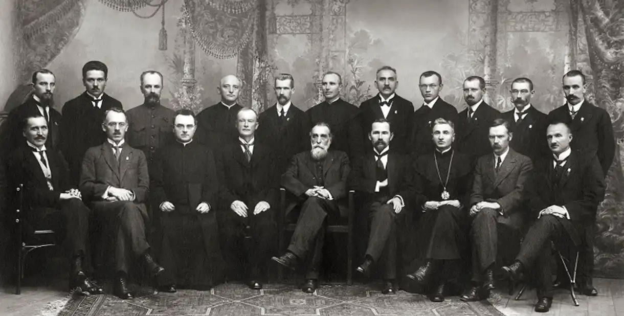 Lietuvos Taryba – 1918 m. Vasario 16-osios Akto signatarai. Šaltinis: fotografė Aleksandra Jurašaitytė / Kauno arkivyskupijos kurijos archyvas. Alb. 18-6