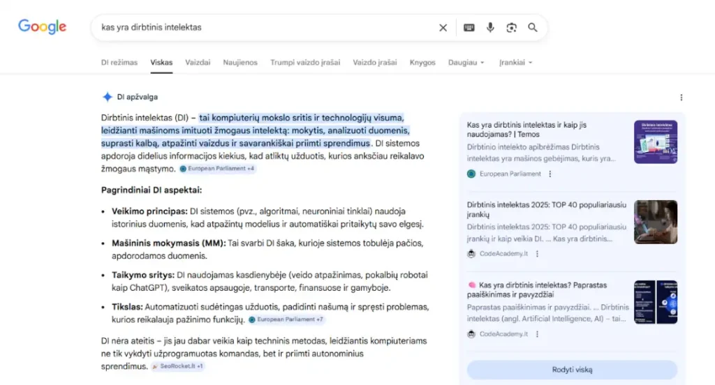 Taip pat patariama patikrinti informaciją keliuose skirtinguose šaltiniuose. Jei svarbus faktas minimas tik DI sugeneruotoje santraukoje, tačiau jo nepavyksta rasti kitur, verta į jį žiūrėti atsargiai.
