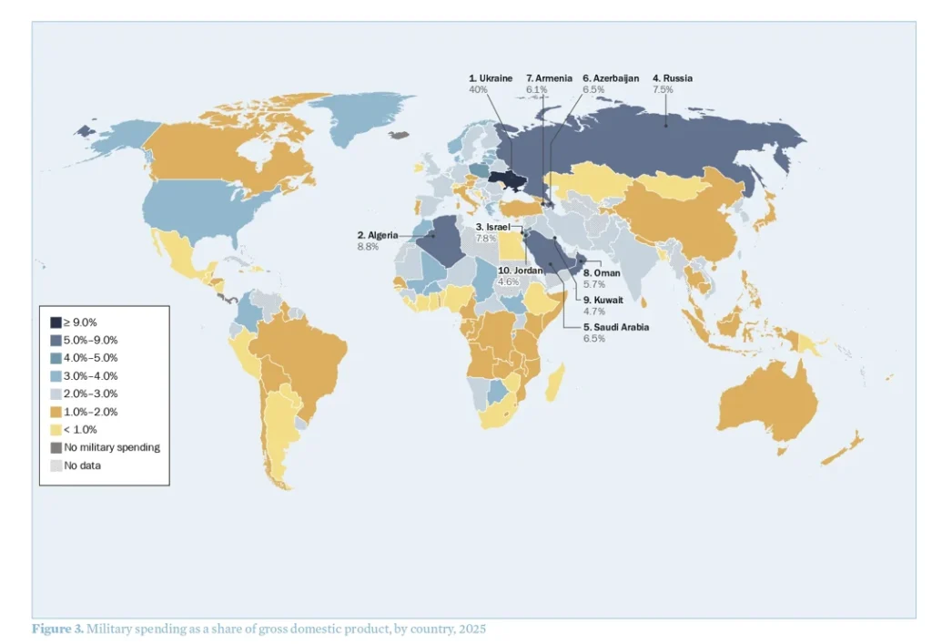 Didėjantis finansavimas tiesiogiai siejamas su geopolitine situacija. Karas Ukrainoje, įtampa tarp didžiųjų valstybių, kaip JAV ir Kinija, bei nestabilumas Artimuosiuose Rytuose skatina šalis investuoti į kariuomenę ir modernizuoti ginkluotę. Ypač išsiskiria Ukraina, kuri 2025 metais gynybai skyrė apie 40 proc. savo BVP – vieną didžiausių rodiklių pasaulyje.