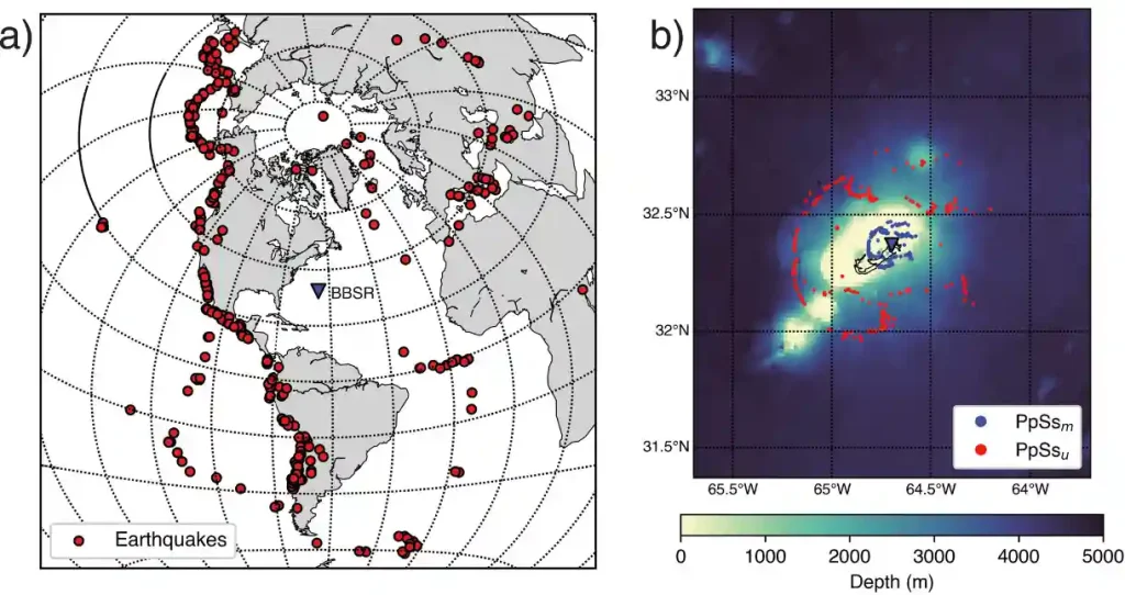 (b) Vietos, kuriose seisminių bangų signalai „atsispindi“ nuo giliųjų Žemės sluoksnių, leidžiančios mokslininkams nustatyti Žemės plutos ribą (Moho) ir po ja esantį papildomą sluoksnį. Šie duomenys gauti iš (a) dalyje pavaizduotų žemės drebėjimų, naudojant tyrime taikytą skaičiavimų modelį. Fone pateiktas vandenyno dugno reljefo vaizdas pagal Smith ir Sandwell (1997) duomenis