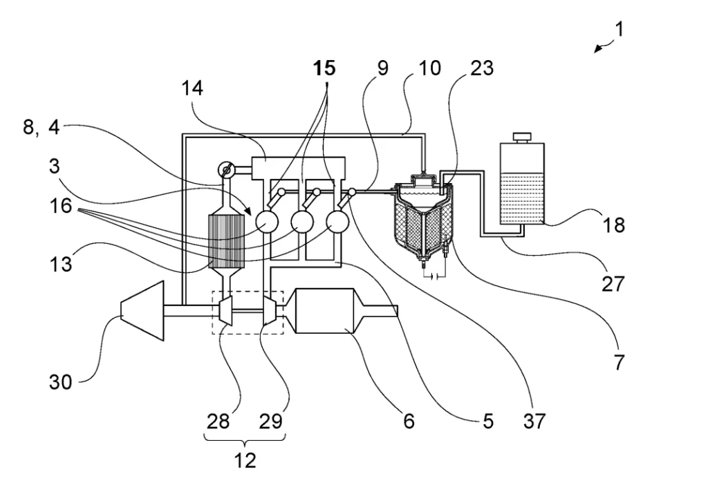 „Porsche“ patento schemoje parodyta sistema, kurioje iš vandens generuojamas vandenilis naudojamas vidaus degimo variklio užvedimo metu, siekiant sumažinti emisijas šalto starto fazėje. Šaltinis: DPMA / „Porsche“