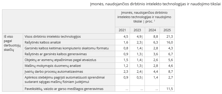 2025 m. Lietuvoje dirbtinio intelekto (DI) technologijas naudojo 21,3 proc. įmonių – maždaug dvigubai daugiau nei 2024 m., kai jų buvo 8,8 proc. Tokią tendenciją atskleidė oficiali Lietuvos statistika, analizuojanti įmonių technologinę pažangą pagal darbuotojų skaičių ir naudojimo tikslus. Sparčiausiai augo tekstų analizės ir generavimo sprendimai, o automatizavimo technologijos tapo vienu pagrindinių verslo produktyvumo variklių.