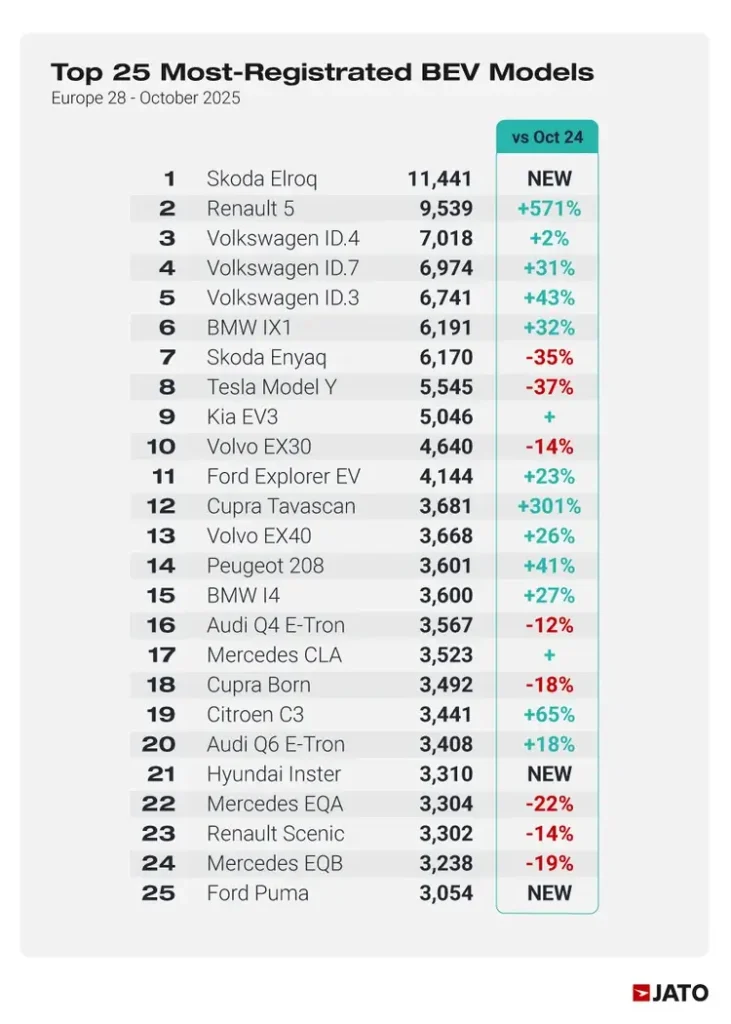 Europos naujų automobilių rinka 2025 m. spalį augo 4,8 proc., o pagrindiniai augimo varikliai buvo baterijomis varomi ir įkraunami hibridiniai automobiliai. Remiantis „JATO Dynamics“ duomenimis, vien tik baterijomis varomų elektromobilių registracijos pasiekė daugiau nei 224 tūkst. vienetų ir per metus išaugo 33 proc., o jų dalis rinkoje pakilo iki 20,6 proc.