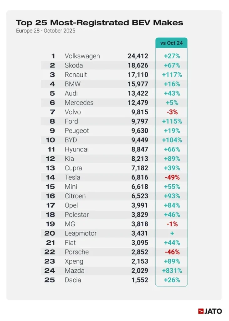Tuo metu Europoje į viršų išsiveržė ir vietiniai gamintojai. 2025 m. daugiausiai elektromobilių regione pardavė „Volkswagen“ – apie 274 tūkst. automobilių, kai „Tesla“ pardavimai siekė maždaug 236 tūkst. Vokietijos gamintojo rezultatai per metus išaugo apie 56 proc., o pagrindinį postūmį suteikė nauji modeliai, kaip „ID.7“ ir platesnis pasirinkimas skirtinguose segmentuose.